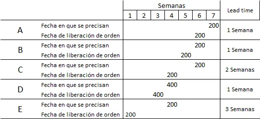 Así podemos observar que de plantearnos una fecha objetivo de obtención del producto terminado A, hemos de producir el componente C 3 semanas antes de la semana objetivo por ejemplo. Así que el tiempo mínimo de obtención de A es de 6 semanas, suponiendo la consecución de todos sus componentes. Esta relación de tiempo puede tabularse en conjunto con las cantidades de la explosión de materiales, y nos quedará un Plan de Requerimientos Brutos como el siguiente: