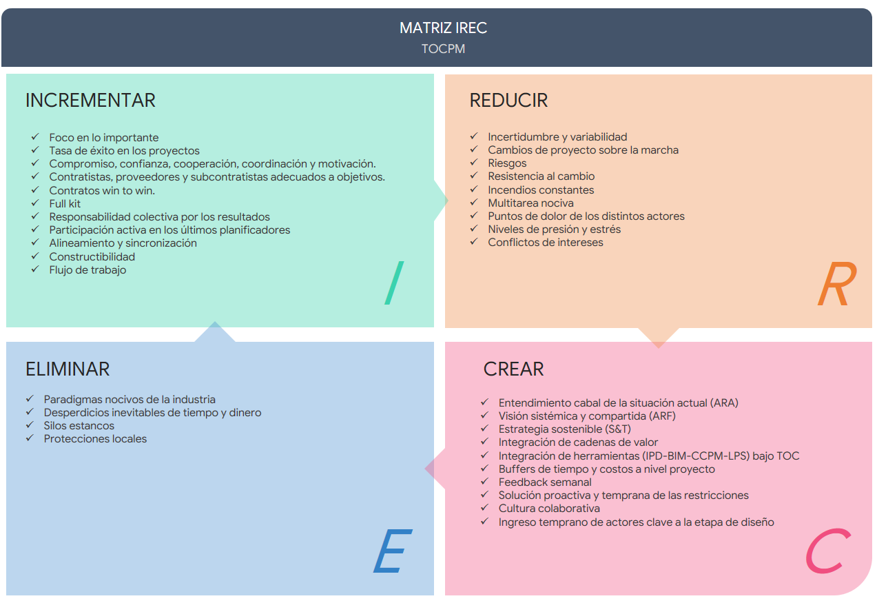 Por el contrario, con TOCPM, además de reducir los cambios, los conflictos, la mala multitarea, las presiones y los riesgos, incrementamos el flujo de trabajo, la motivación y cooperación de las personas, la sincronización de los distintos actores, el Full Kit y creamos una nueva cultura de gestión con foco en el valor y el largo plazo integrando las cadenas de valor y haciendo que los contratistas potenciales y subcontratistas ingresen en las etapas iniciales de los proyectos de modo de garantizar la constructibilidad integrando IPD (Integrated Project Delivery), BIM (Building Information Modeling), CCPM (Cadena Crítica) y LPS (Last Planner System) bajo el paraguas de TOC (Theory of Constraints).