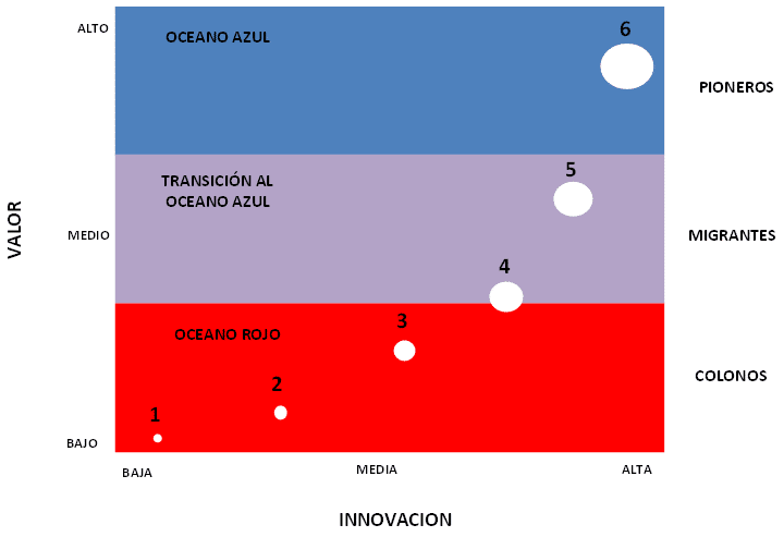 En este mapa los colonos son las empresas que compiten con las prácticas tradicionales, realizando mejoras incrementales de bajo costo y poco valor agregado. Por su parte, los migrantes operan con una propuesta de mayor valor para sus clientes con algún tipo de innovación en la prestación del servicio. En cambio, los pioneros son aquellas pocas empresas que se atreven a dar un salto disruptivo en la generación de valor por medio de una fuerte innovación en la prestación del servicio, abriendo una nueva frontera de valor y coste. TOCPM es, sin ningún lugar a dudas, una estrategia de pioneros.