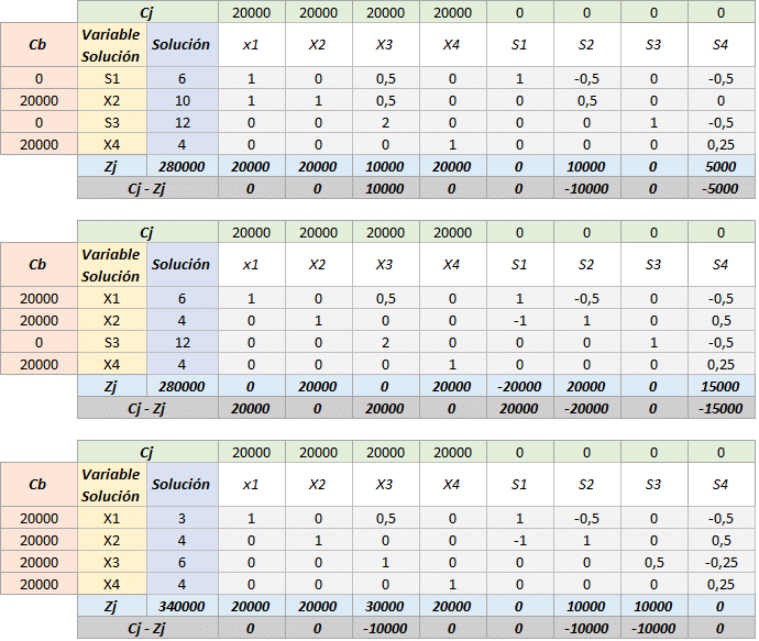 En nuestro caso de ejemplo, todos los Cj – Zj son iguales a 20000, por lo tanto, la decisión debe tomarse de forma arbitraria, es decir, puede elegirse cualquiera como variable de entrada. Elegiremos la variable X4 ¿Por qué? Porque sí, lo estamos haciendo de forma arbitraria para romper el empate.