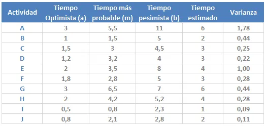 Para las actividades del tabulado mencionado en el Paso 1, los tiempos estimados y varianzas serían las siguientes: