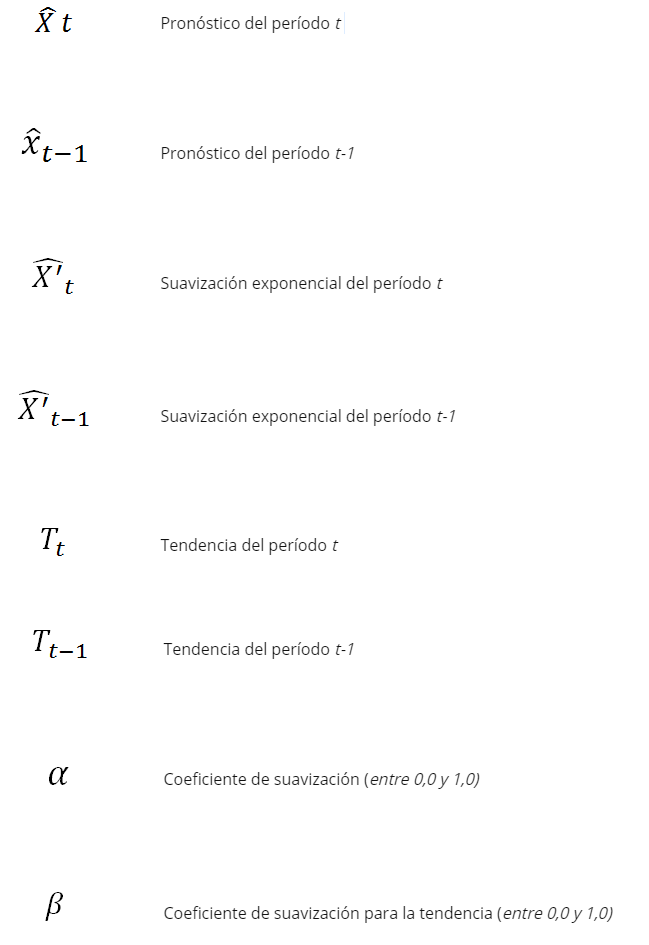 El método de suavización exponencial doble o método de Holt usa tres ecuaciones fundamentales:
